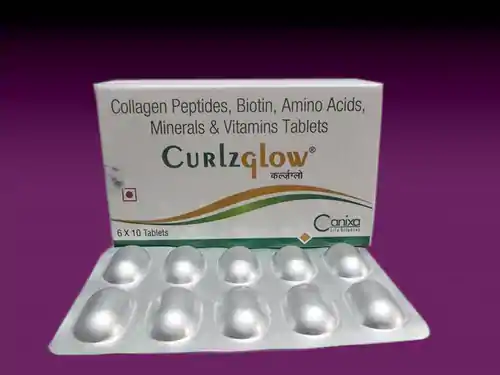 Curlzglow Tablet is a rich combination of Biotin, Calcium pantothenate, Collagen peptide, DL-methionine, Copper, Iron, Manganese, Selenium, Zinc, Folic acid, Inositol, L-lysine, N-Acetylcysteine (NAC), Niacinamide and Vitamin B2.